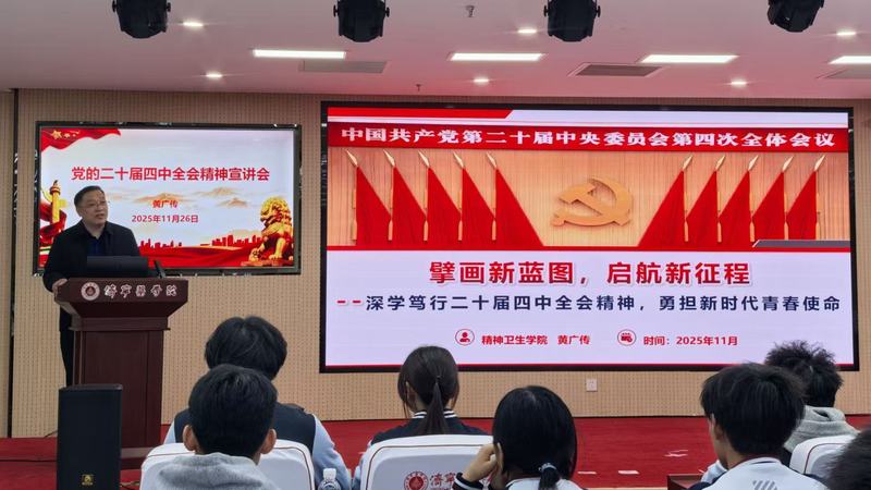 11月26日,精神卫生学院党总支书记黄广传以“擘画新蓝图,启航新征程”为主题,为学院2025-2026学年“青马工程”学员讲授专题党课。